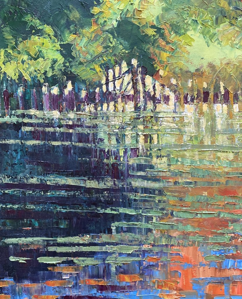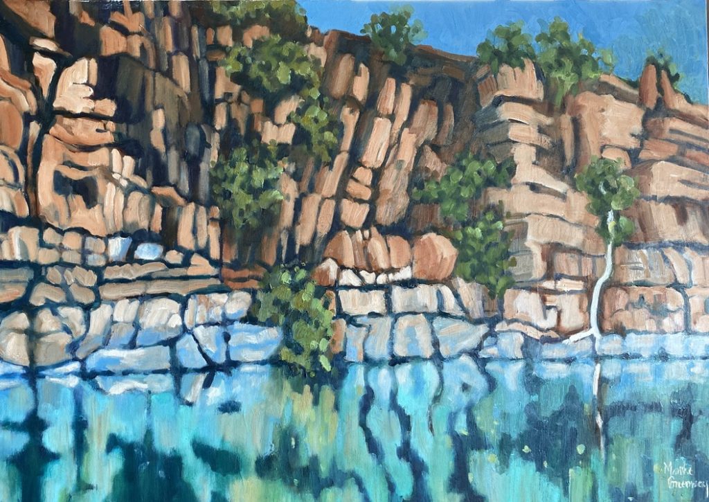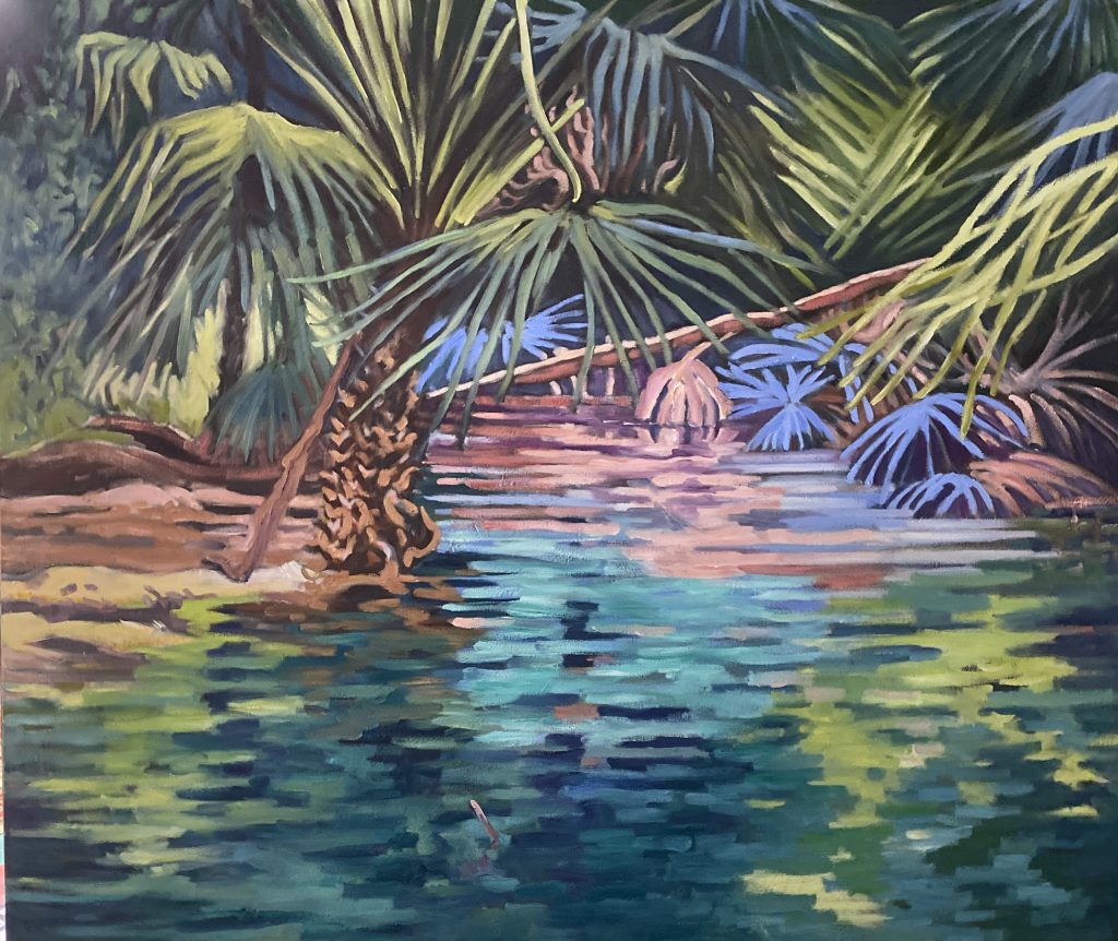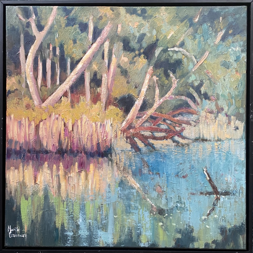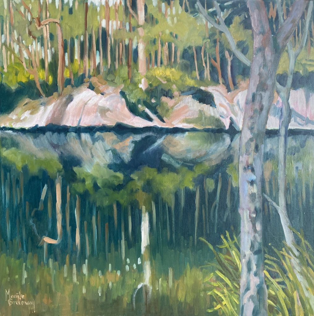 Reflections Pearl Beach Lagoon. Oil 64×64 $950